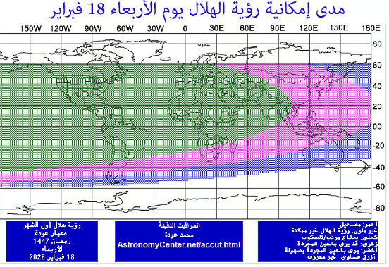 The maps below the visibility of the crescent moon of Ramadan on Tuesday, February 17 and Wednesday, February 18th, across the world: