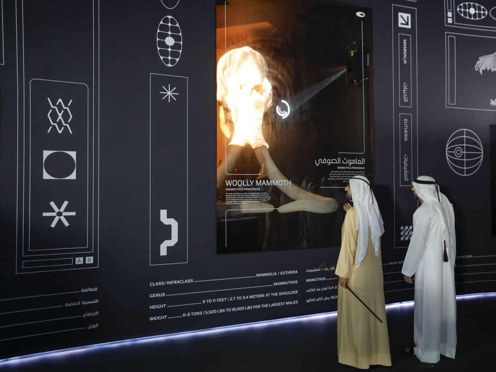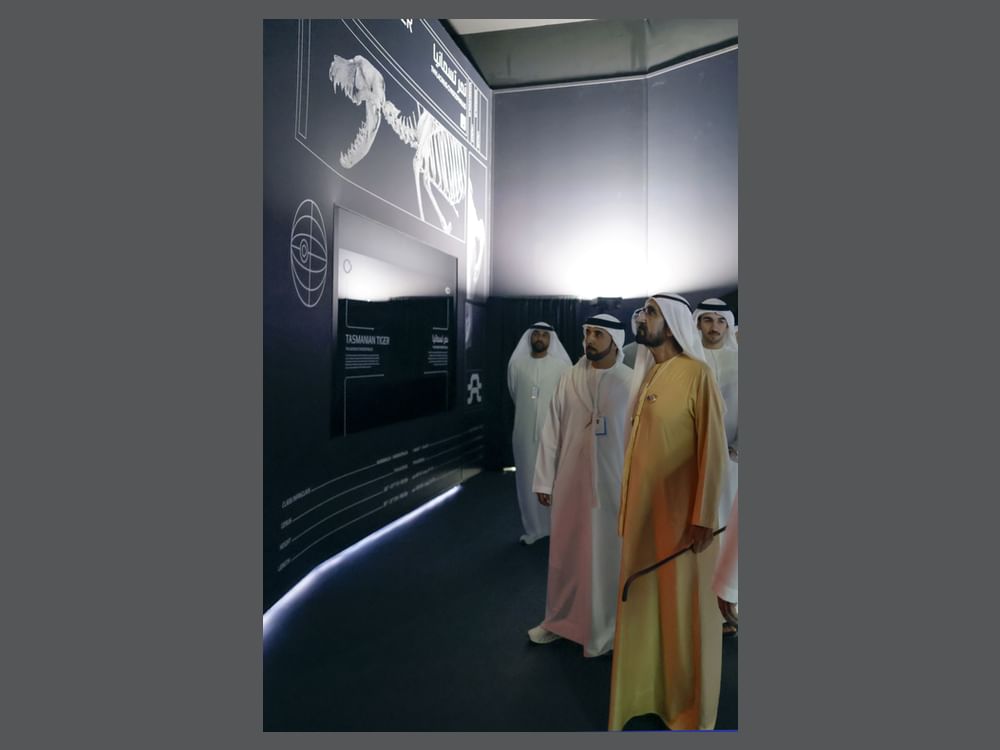 During the tour, H.H. Sheikh Mohammed explored the exhibit’s various sections, designed to introduce visitors to the latest scientific innovations and developments aimed at protecting endangered species, restoring extinct species and ecosystems, and conserving natural environments.