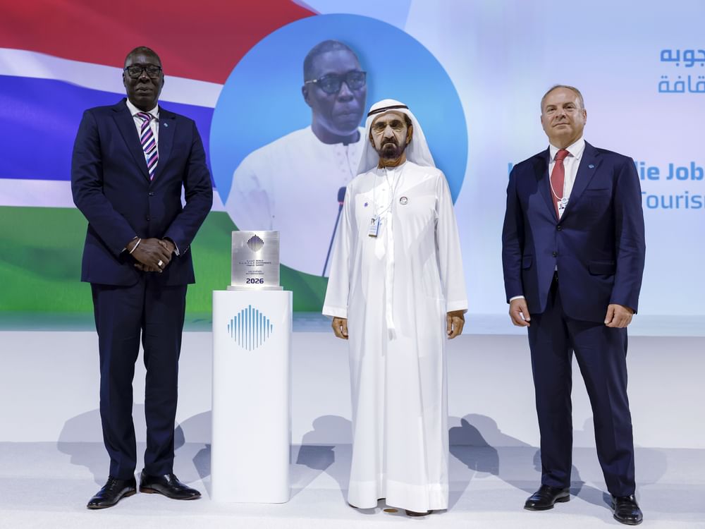 emirates7 - His Highness Sheikh Mohammed bin Rashid Al Maktoum, Vice President and Prime Minister of the UAE and Ruler of Dubai, in the presence of H.H. Sheikh Hamdan bin Mohammed bin Rashid Al Maktoum, Crown Prince of Dubai, Deputy Prime Minister and Minister of Defence of the UAE, and Chairman of The Executive Council of Dubai; H.H. Sheikh Ammar bin Humaid Al Nuaimi, Crown Prince of Ajman; H.H. Sheikh Mohammed bin Hamad bin Mohammed Al Sharqi, Crown Prince of Fujairah; and honoured Abdoulie Jobe, Minister of Tourism and Culture of Gambia, with the Best Minister Award at the World Governments Summit (WGS) 2026.
