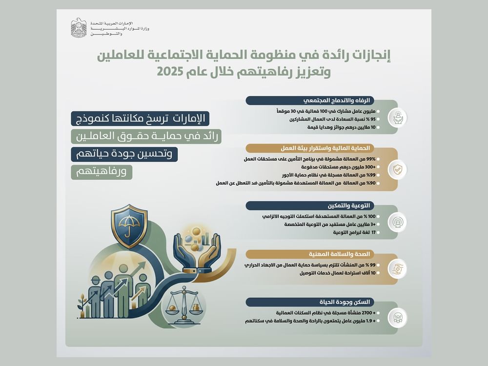 emirates7 - The Ministry of Human Resources and Emiratisation (MoHRE) announced that the social security system for workers in the labour market has made ground-breaking achievements, reporting remarkable results in terms of protecting workers’ financial entitlements and enhancing their awareness over the past year (2025).