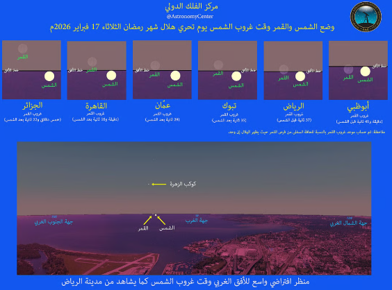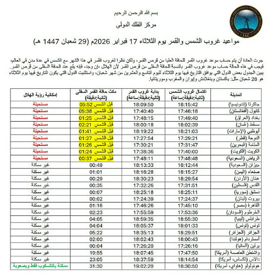 The astronomical data table circulated by the centre focuses only on countries where Tuesday corresponds to the 29th of Shaban. Nations where the day falls on the 28th — including Pakistan, Bangladesh, Iran, Morocco and Mauritania — were excluded, as they will observe the crescent a day later.