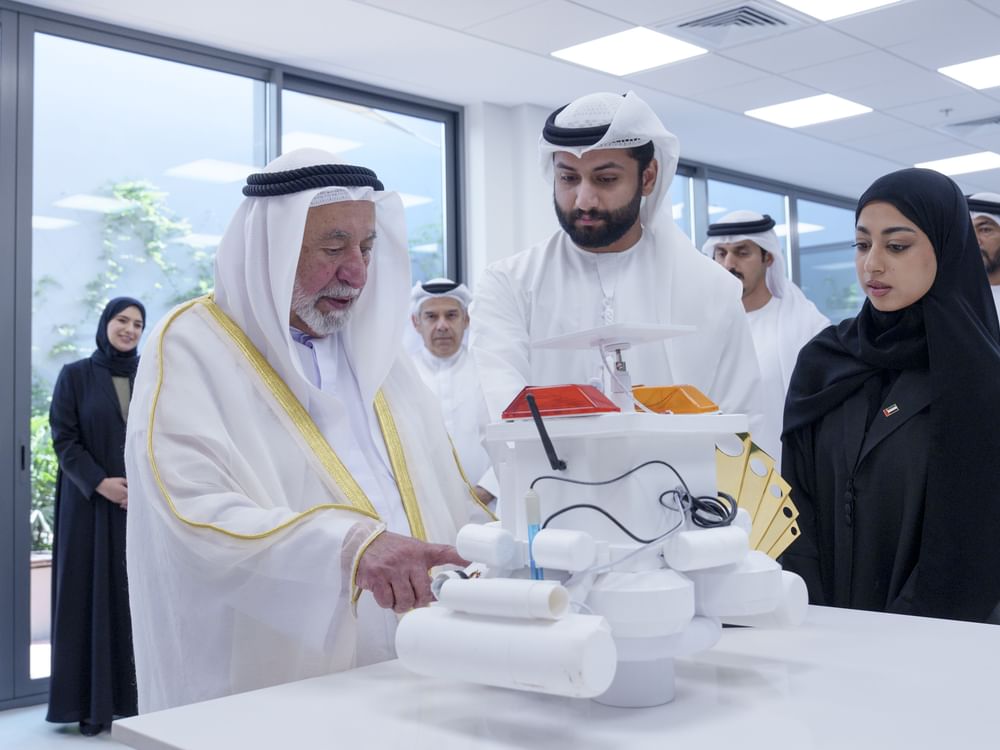 H.H. Sheikh Dr Sultan bin Mohammed Al Qasimi reviewed a range of state-of-the-art instruments and technologies used by students, learning how they help detect marine pollution, monitor bacterial growth, and separate contaminated water from clean samples. He also observed demonstrations of measuring solid waste and marine debris, along with samples of both polluted and clean water.