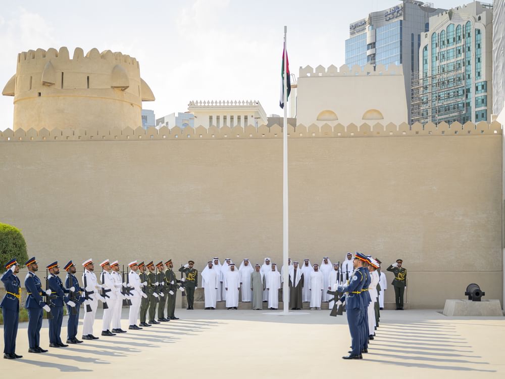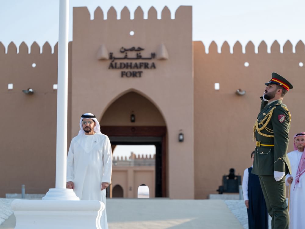 emirates7 - H.H. Sheikh Hamdan bin Zayed Al Nahyan, Ruler’s Representative in Al Dhafra Region, has raised the UAE flag at Al Dhafra Fort to mark Flag Day, celebrated annually on 3rd November as a national occasion to renew loyalty to the nation and reaffirm commitment to preserving its achievements, protecting its values, and advancing its development.