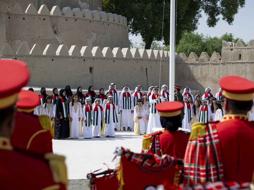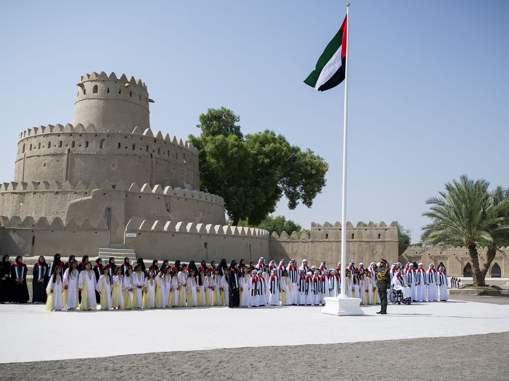 The official ceremony, attended by families of fallen heroes and school students from Al Ain Region, featured the UAE Armed Forces’ military band performing the national anthem, followed by the raising of the flag at Al Jahili Fort.