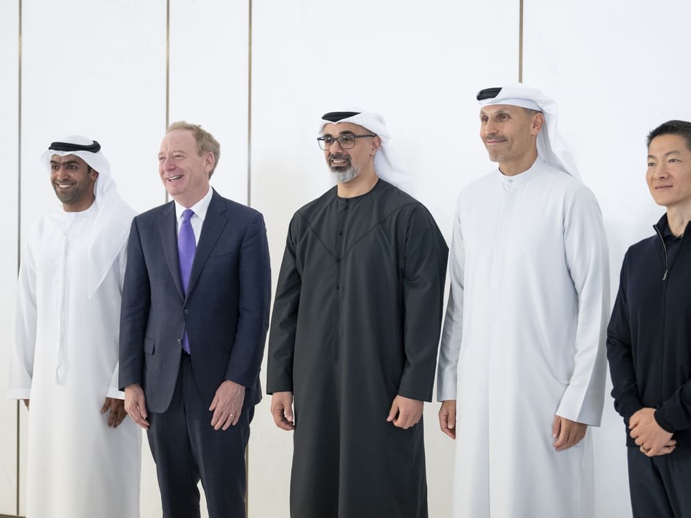 H.H. Sheikh Khaled bin Mohamed bin Zayed Al Nahyan, Crown Prince of Abu Dhabi and Chairman of the Abu Dhabi Executive Council, was briefed by Brad Smith, Vice Chair and President of Microsoft, on its future investment plans in the UAE, including expanding AI and digital infrastructure, and upskilling local talent through training programmes and research and development initiatives.