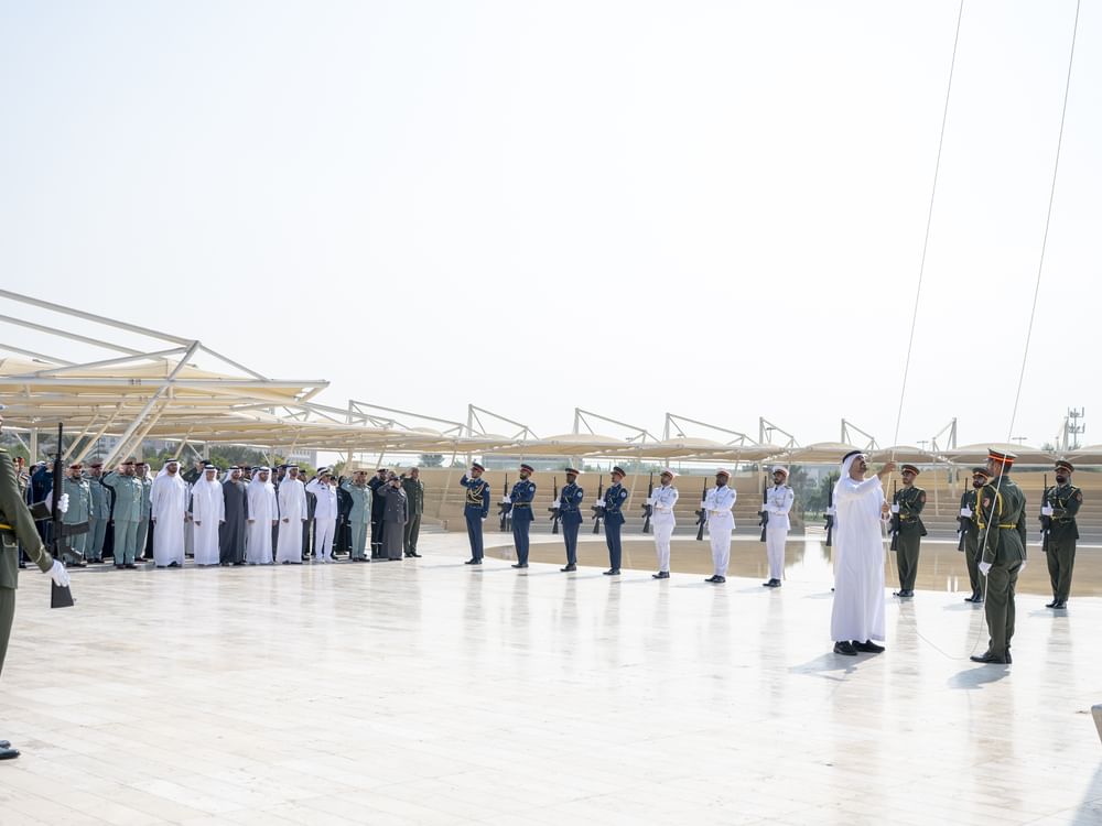 emirates7 -  H.H. Sheikh Theyab bin Mohamed bin Zayed Al Nahyan, Deputy Chairman of the Presidential Court for Development and Fallen Heroes' Affairs, has raised the UAE flag at Wahat Al Karama, Abu Dhabi, to mark Flag Day.