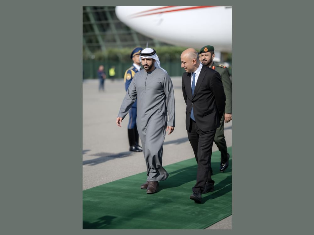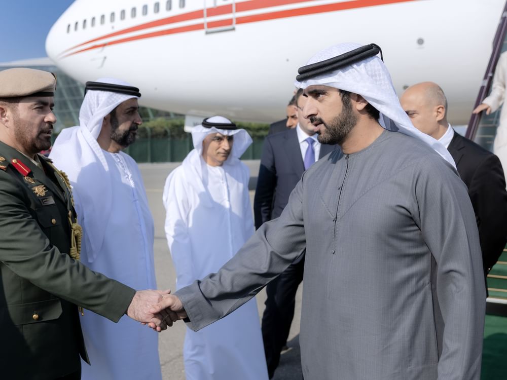 emirates7 - On behalf of President His Highness Sheikh Mohamed bin Zayed Al Nahyan, H.H. Sheikh Hamdan bin Mohammed bin Rashid Al Maktoum, Crown Prince of Dubai, Deputy Prime Minister, and Minister of Defence of the UAE, arrived today morning in the Azerbaijani capital, Baku, leading a high-level delegation to participate in Azerbaijan’s ‘Victory Day’ celebrations.