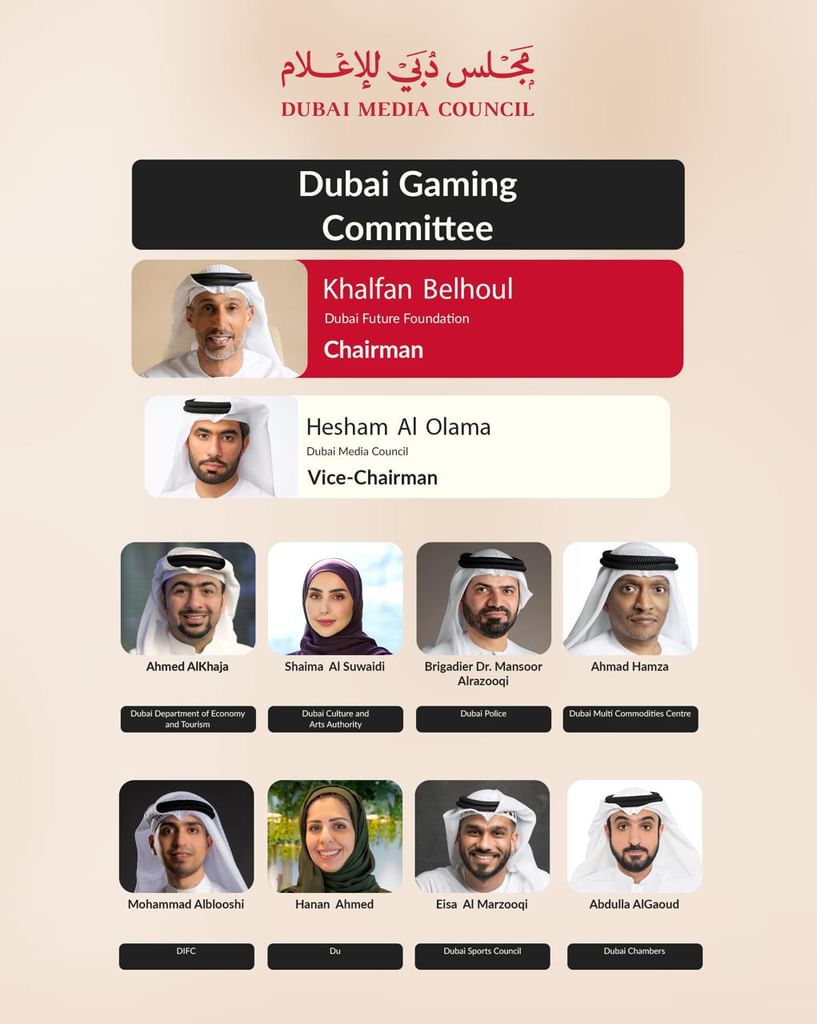 Members of the Dubai Gaming Committee include, Hesham Al Olama, Dubai Media Council, who will serve as Vice-Chairman, Ahmed AlKhaja, Dubai Department of Economy and Tourism; Shaima Al Suwaidi, Dubai Culture and Arts Authority; Brigadier Dr. Mansoor Alrazooqi, Dubai Police; Ahmad Hamza, Dubai Multi Commodities Centre; Mohammad Alblooshi, Dubai International Financial Centre; Hanan Ahmed, du; Eisa Al Marzooqi, Dubai Sports Council; and Abdulla AlGaoud, Dubai Chambers.
