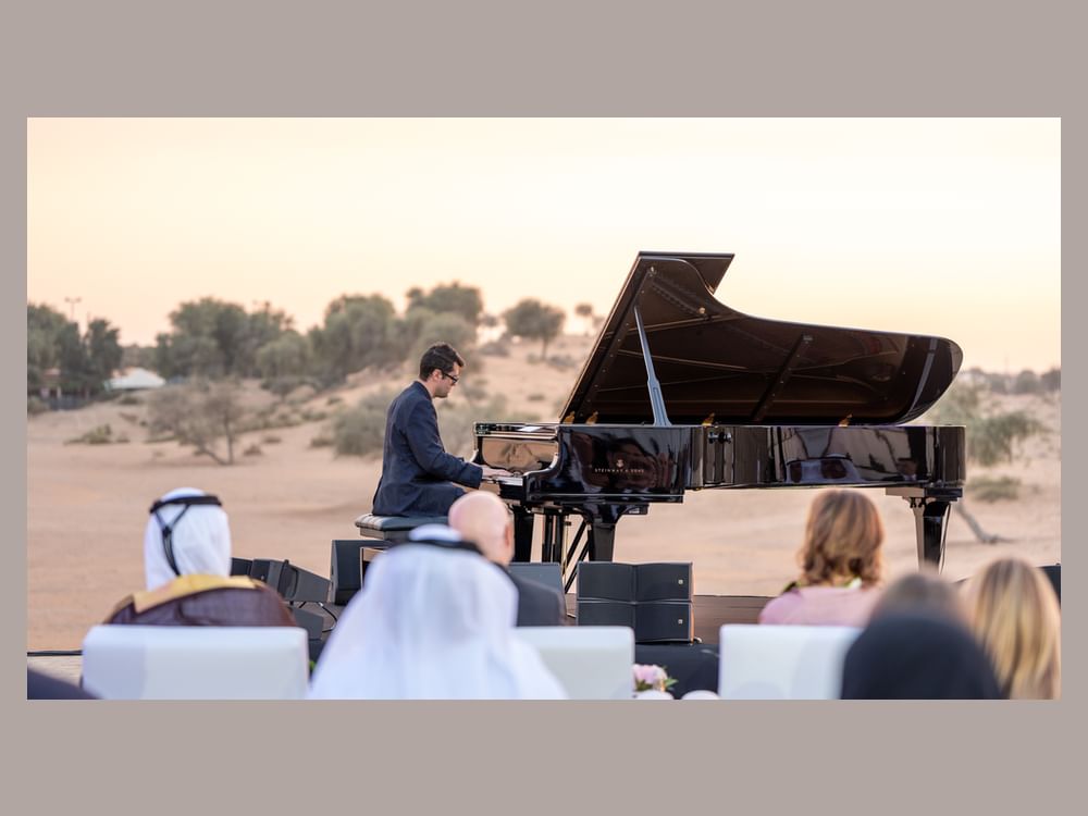 emirates7 - H.H. Sheikh Saud bin Saqr Al Qasimi, Supreme Council Member and Ruler of Ras Al Khaimah, attended a performance by acclaimed Italian pianist and composer Alessandro Martire, titled "Desert Waves: A Musical Journey," held at the Ritz-Carlton Ras Al Khaimah, Al Wadi Desert.