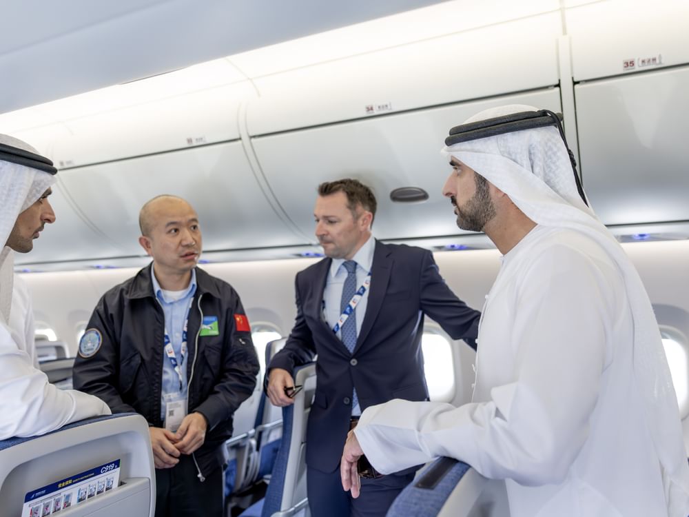 Sheikh Hamdan was also briefed on Gulfstream’s G800 and G700 jets, and COMAC C919, China’s first commercial aircraft, seating 168 passengers with improved fuel efficiency and digital flight systems, reflecting China’s expanding presence in global aviation.