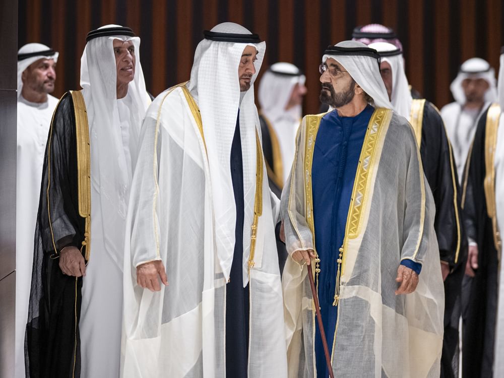 Also in attendance were H.H. Sheikh Khaled bin Mohamed bin Zayed Al Nahyan, Crown Prince of Abu Dhabi; H.H. Sheikh Hamdan bin Mohammed bin Rashid Al Maktoum, Crown Prince of Dubai, Deputy Prime Minister and Minister of Defence; H.H. Sheikh Sultan bin Mohammed bin Sultan Al Qasimi, Crown Prince and Deputy Ruler of Sharjah; H.H. Sheikh Ammar bin Humaid Al Nuaimi, Crown Prince of Ajman; H.H. Sheikh Mohammed bin Hamad bin Mohammed Al Sharqi, Crown Prince of Fujairah; H.H. Sheikh Rashid bin Saud bin Rashid Al Mu'alla, Deputy Ruler of Umm Al Qaiwain; H.H. Sheikh Mohammed bin Saud bin Saqr Al Qasimi, Crown Prince of Ras Al Khaimah; H.H. Sheikh Sultan bin Ahmed bin Sultan Al Qasimi, Deputy Ruler of Sharjah; H.H. Sheikh Ahmed bin Saud bin Rashid Al Mu'alla, Deputy Ruler of Umm Al Qaiwain; H.H. Sheikh Hamdan bin Zayed Al Nahyan, Ruler’s Representative in Al Dhafra Region; H.H. Sheikh Hazza bin Zayed Al Nahyan, Ruler's Representative in Al Ain Region; H.H. Sheikh Saif bin Mohammed Al Nahyan; H.H. Sheikh Suroor bin Mohammed Al Nahyan; H.H. Sheikh Nahyan bin Zayed Al Nahyan, Chairman of the Board of Trustees of the Zayed Charitable and Humanitarian Foundation; H.H. Lt. General Sheikh Saif bin Zayed Al Nahyan, Deputy Prime Minister and Minister of the Interior; H.H. Sheikh Hamed bin Zayed Al Nahyan; H.H. Sheikh Abdullah bin Zayed Al Nahyan, Deputy Prime Minister and Minister of Foreign Affairs; H.H. Sheikh Omar bin Zayed Al Nahyan, Vice Chairman of the Board of Trustees of the Zayed bin Sultan Al Nahyan Charitable and Humanitarian Foundation; H.H. Sheikh Khalid bin Zayed Al Nahyan, Chairman of the Board of Directors of the Zayed Higher Organisation for People of Determination (ZHO); H.H. Sheikh Dr. Sultan bin Khalifa Al Nahyan, Adviser to the UAE President; H.H. Sheikh Theyab bin Mohamed bin Zayed Al Nahyan, Deputy Chairman of the Presidential Court for Development and Fallen Heroes’ Affair, H.H. Sheikh Hamdan bin Mohamed bin Zayed Al Nahyan, Deputy Chairman of the Presidential Court for Special Affairs; H.H. Sheikh Zayed bin Mohamed bin Zayed Al Nahyan; along with a number of sheikhs and senior officials.