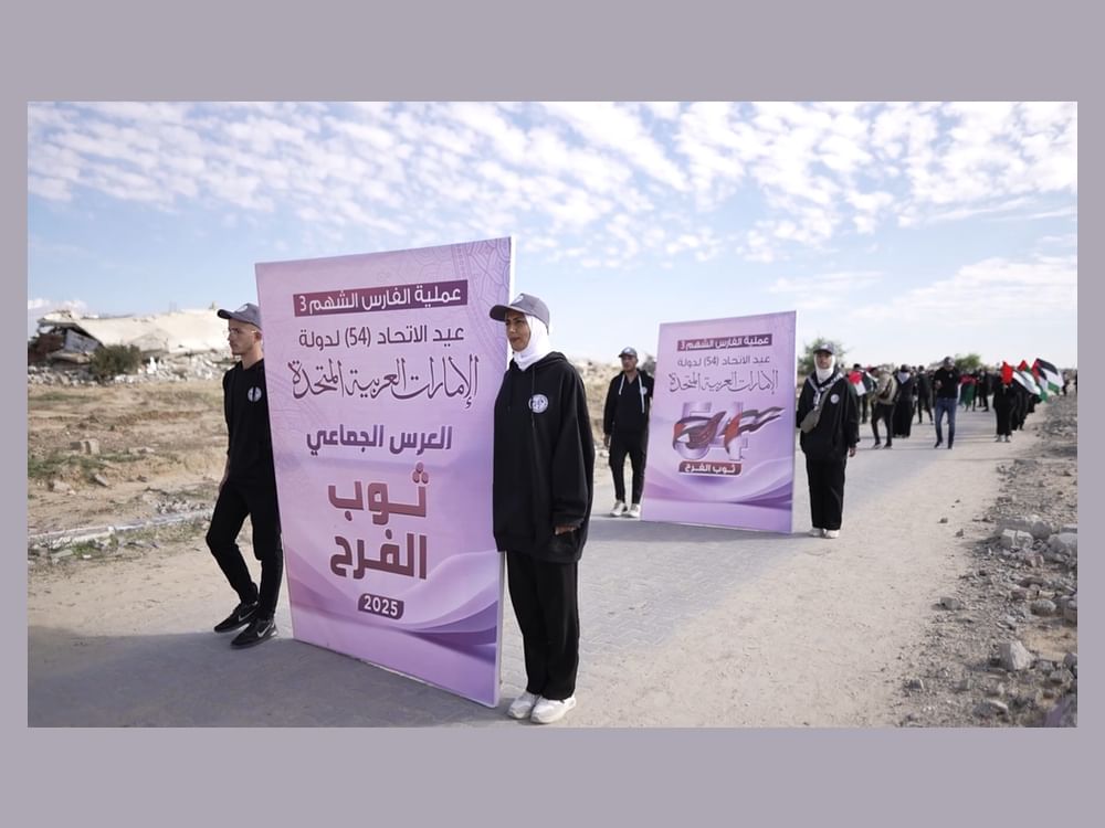 This mass wedding was held under the slogan “Thawb Al-Farah” (The Garment of Joy), as part of the UAE’s ongoing initiatives to support social stability and to give families in Gaza moments of joy and hope despite harsh circumstances and daily life challenges.