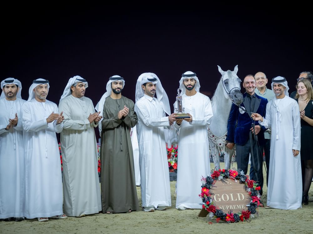 emirates7 - Ajman Stud's mare 'Al Aryam Banafsaj' was crowned Super Gold Champion at the World Arabian Horse Championship 'Supreme' in Doha today in the presence of H.H. Sheikh Tamim bin Hamad Al Thani, Emir of the State of Qatar, Ahmad Al-Sharaa, President of the Syrian Arab Republic, and H.H. Sheikh Ammar bin Humaid Al Nuaimi, Crown Prince of Ajman and Chairman of the emirate's Executive Council. Up to 70 elite purebred Arabian horses from 10 countries took part in the global event.