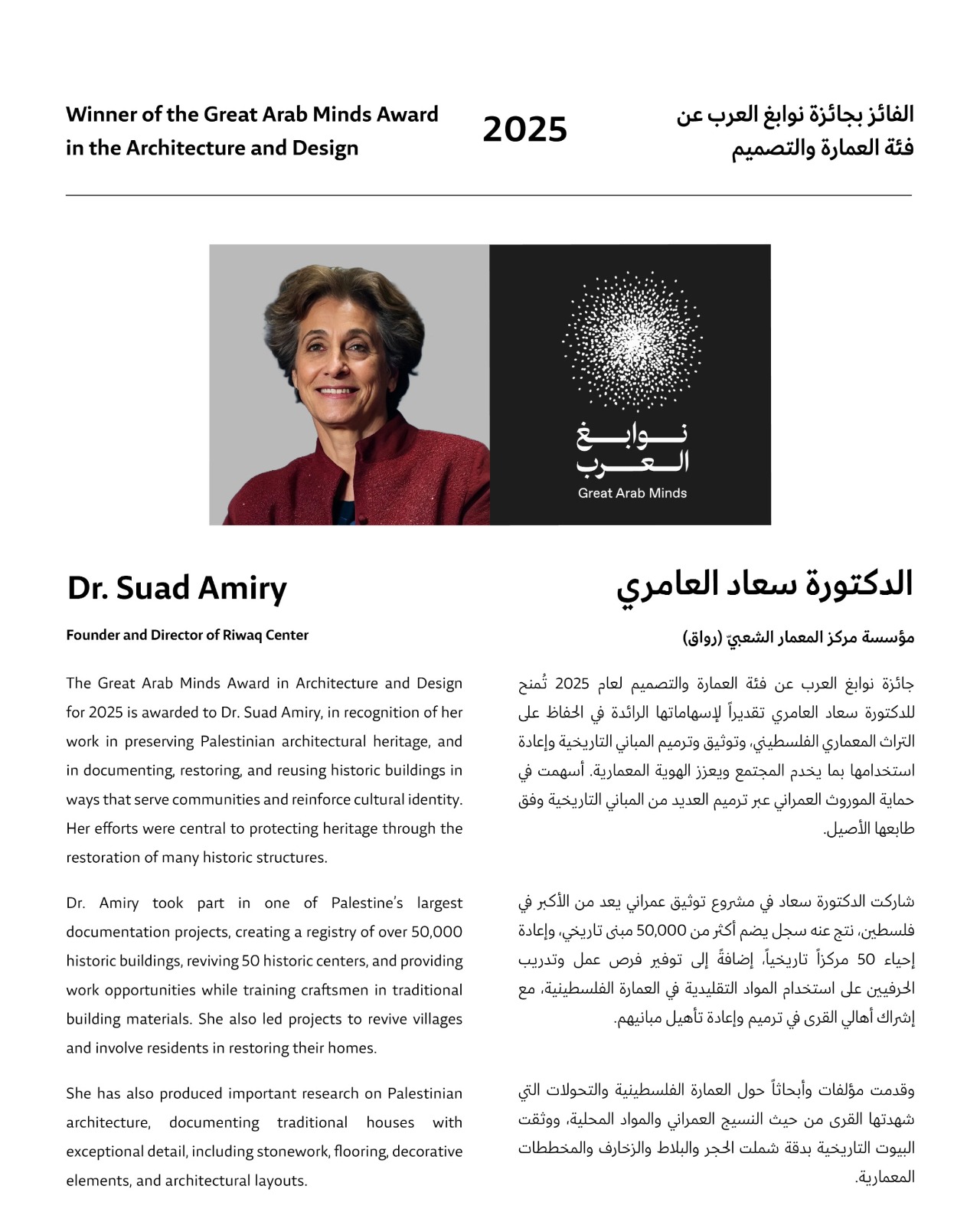 Highlighting the role of architecture in shaping national identity and preserving cultural heritage, His Highness posted on X: “We congratulate the 2025 winner of the Great Arab Minds Award in the Architecture and Design category, Dr Suad Amiry from Palestine, Founder of the Riwaq Centre for Architectural Conservation. She has played a leading role in preserving Palestinian architectural heritage by restoring historic buildings and adapting them in ways that strengthen architectural identity and support local communities. She participated in one of the largest architectural documentation projects in Palestine, registering more than 50,000 historic buildings and contributing to the revitalisation of 50 historic centres. A distinctive aspect of her work is her involvement of residents and artisans in village restoration projects, creating jobs and training them in traditional building materials.”